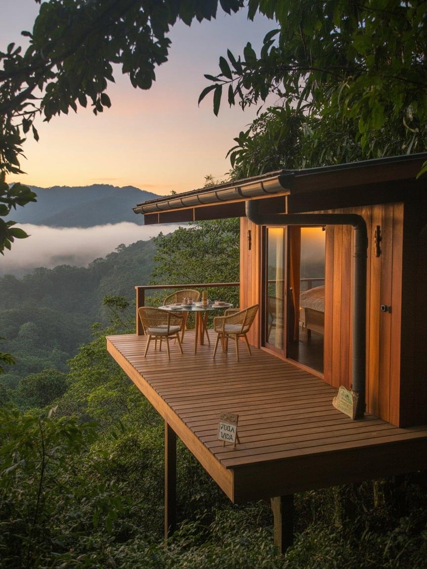 Costa Rica's pristine cloud forest boasts 16 Hillside Sanctuary Cabins at 5,000ft elevation, surrounded by mountains and lush nature.